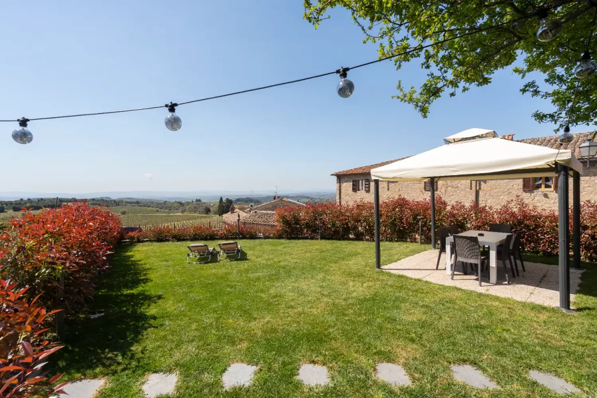 All’esterno, la casa dispone di un giardino privato con vista sui vigneti, condiviso solo con l’altro appartamento della proprietà. È attrezzato con barbecue, tavolo per mangiare all’aperto e lettini prendisole, per goderti momenti di relax sotto il sole toscano o un aperitivo al tramonto.